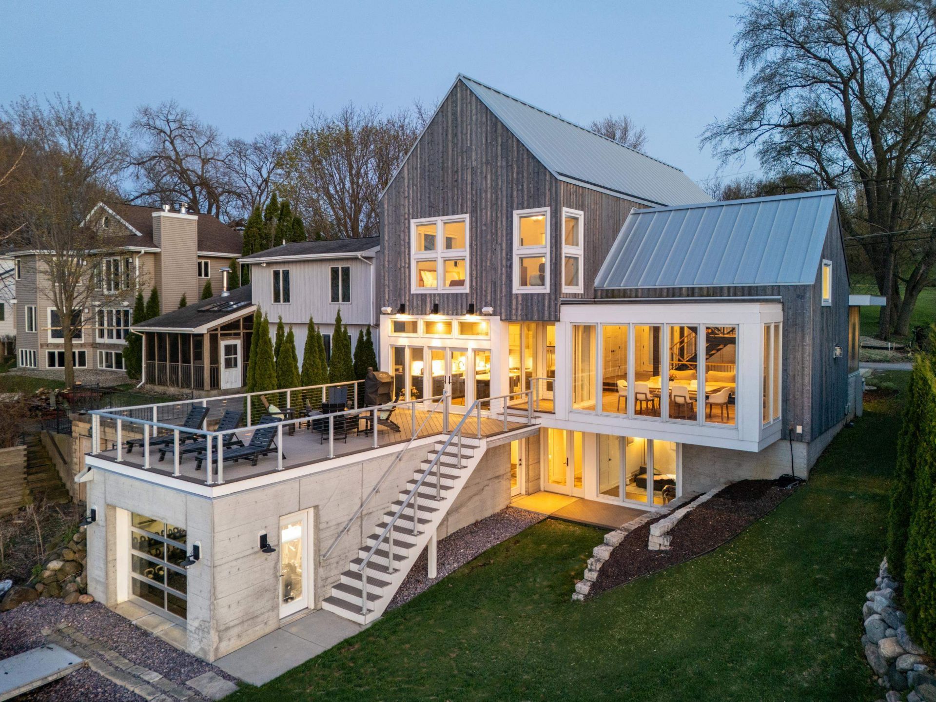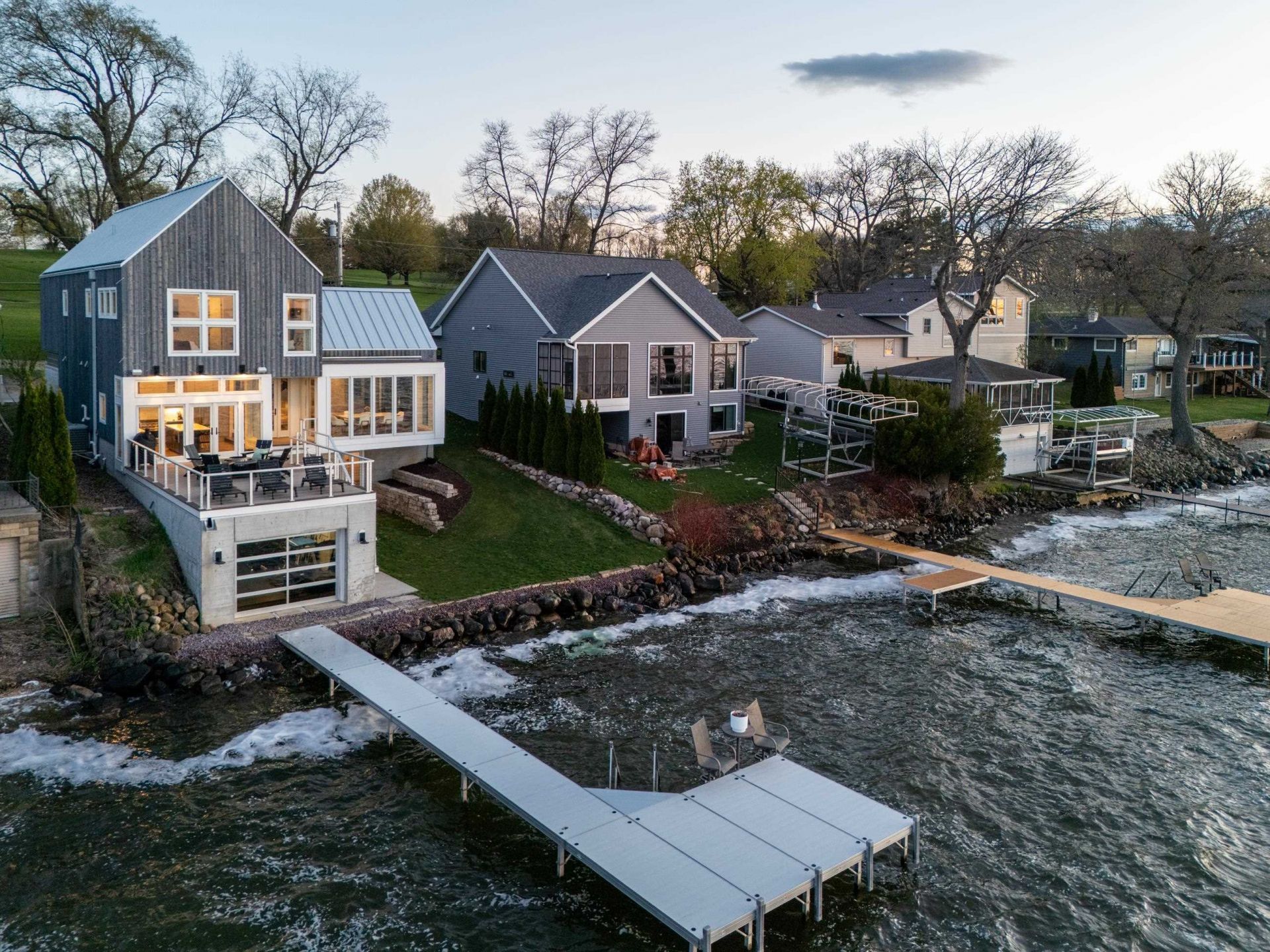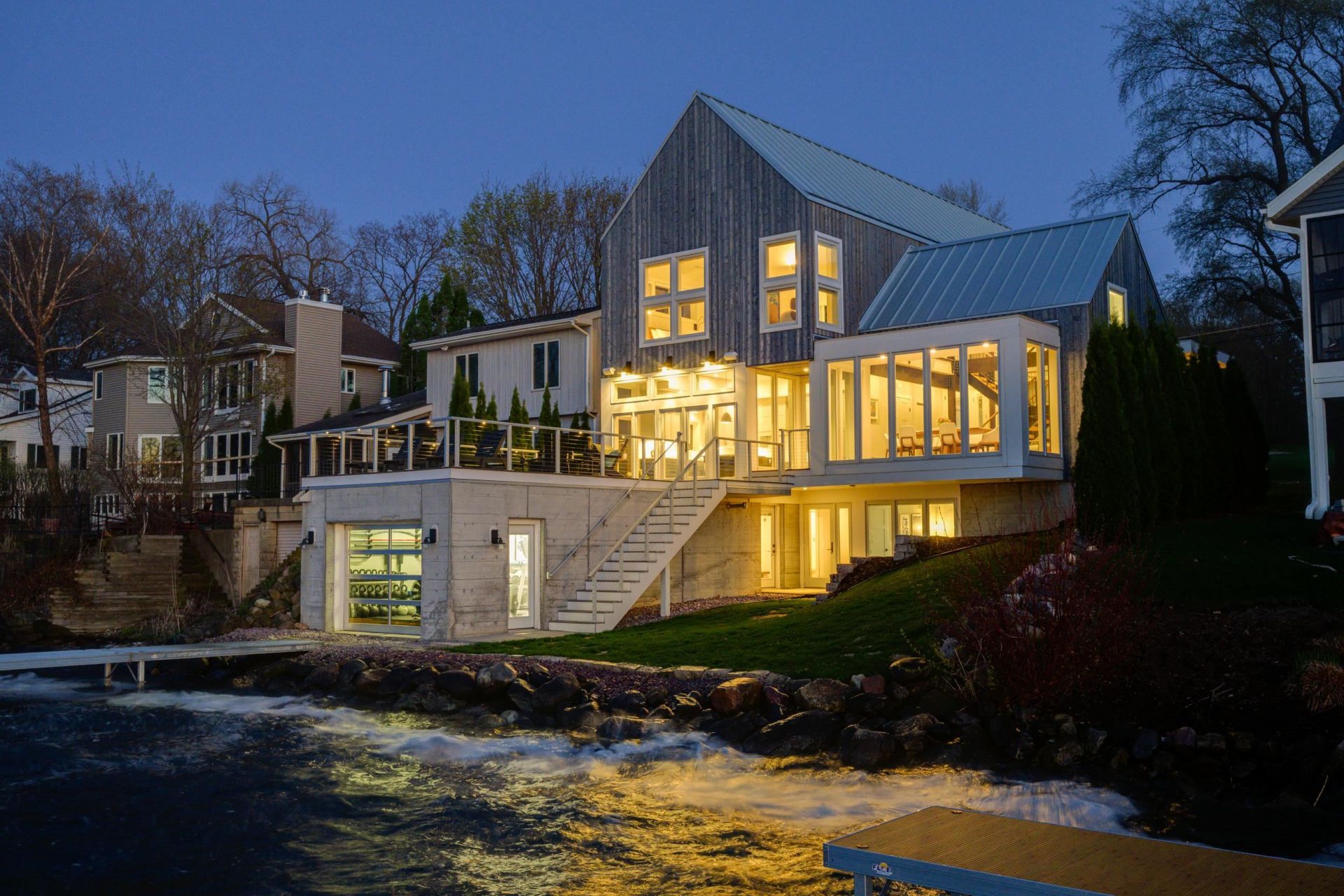 Lakefront luxury meets architectural distinction in this exceptional lake home, complete w/rare attached boathouse. Architecturally designed, this one-of-a-kind residence is uniquely situated at the end of a quiet cul-de-sac & across from golf course. Striking blend of modern design & high-end finishes define the home, featuring exposed arch beams, floating steel staircase, thermal-modified spruce siding & sleek metal roof. Light-filled interior is enhanced by walls of windows capturing both sunrise & sunset views over the water. Custom cabinetry, doors & millwork add warmth & craftsmanship. Built for comfort & efficiency, the home includes in-floor heating thru much of the space, energy-efficient foam insulation, smart home integration & built-in speakers on the main level & large outdoor deck. Opportunity to experience elevated lakefront living w/ exceptional design & proximity to golf & recreation. Attached 370 sq boathouse currently used as heated gym.