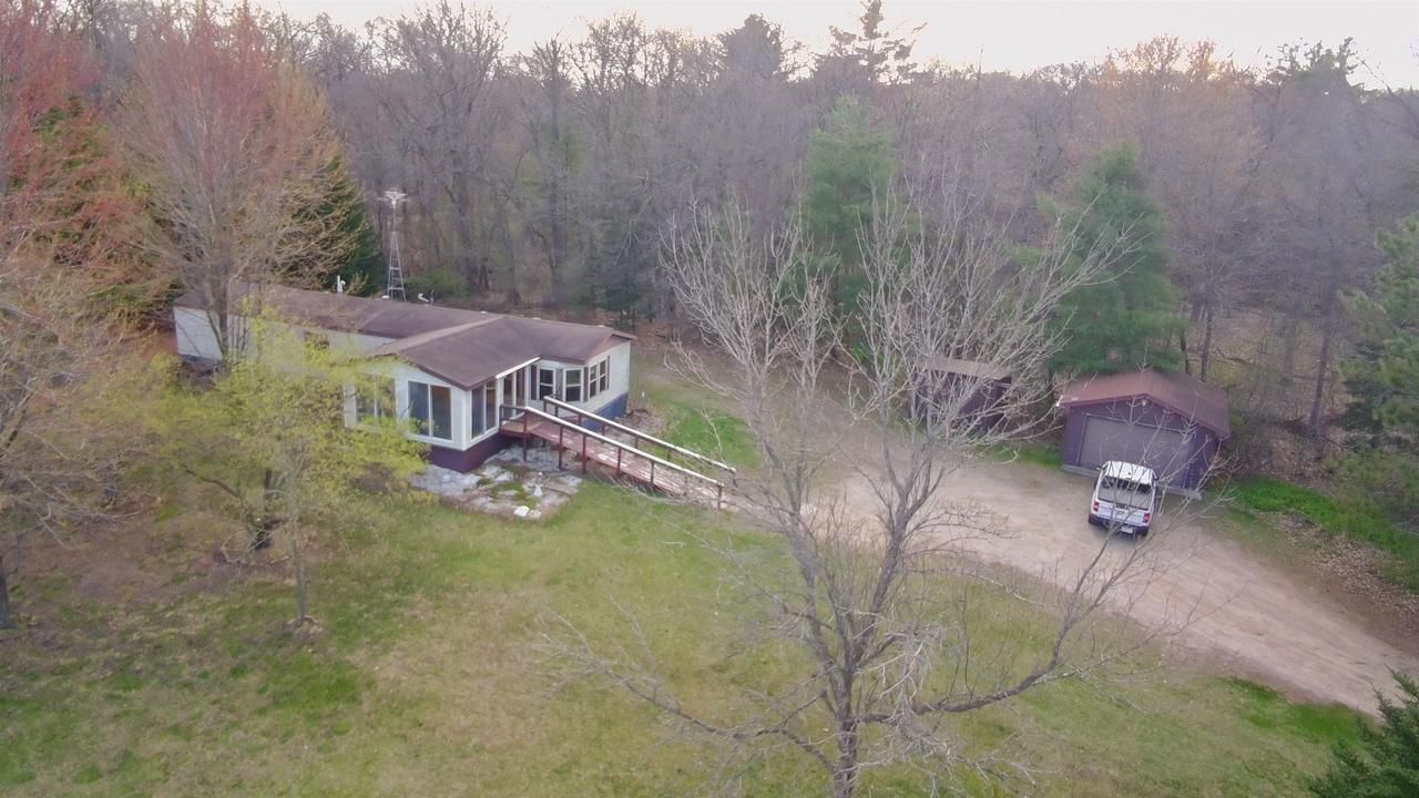 Check out this 2-bedroom, 1-bath single-wide manufactured home built in 1992, set on a beautiful 5 acre tract of land with a scenic rural backdrop. The large open front yard offers views of neighboring ponds, creating a peaceful setting. The property features great wildlife habitat with deer trails throughout and an ideal hunting spot in the back corner, along with a small natural pond near the road for year-round wildlife viewing. An oversized one-car garage and garden shed provide ample storage, and the spacious yard offers room for fencing?perfect for horses or 4-H projects. The home could use some cosmetic updates, but features solid oak, custom-built kitchen cabinets. Relax in the three season sunroom. The home sits on a block and pier foundation with skirting around the exterior.