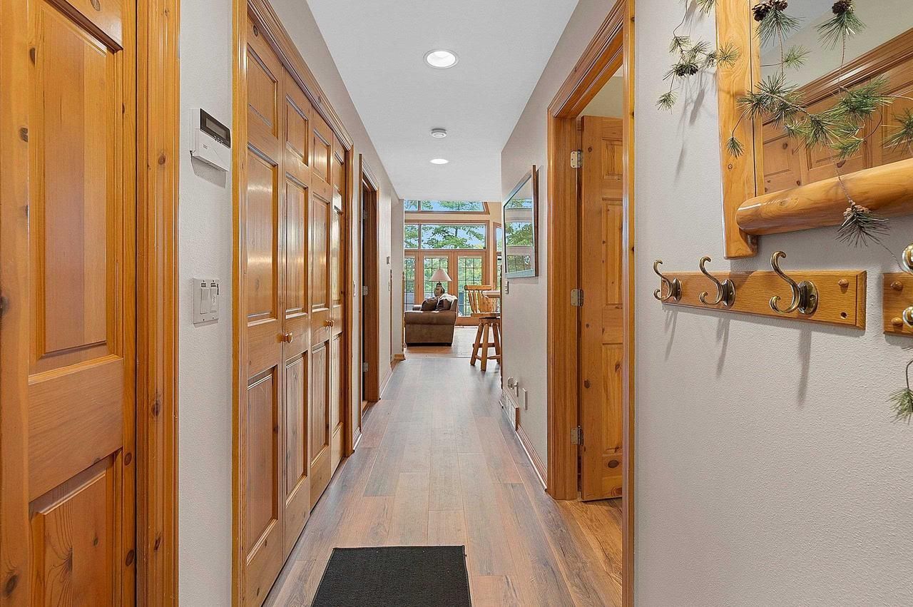 Set along the shoreline of Legend Lake, this waterfront home centers around an open main living area where the great room, dining space, and kitchen connect beneath vaulted ceilings and natural light from floor-to-ceiling windows. Hardwood floors and a brick fireplace anchor the space, while the adjacent four-season room offers a quiet place to relax year-round. A main level bedroom sits near the full bath with walk-in shower and soaking tub. Upstairs, a loft with built-in bunks overlooks the living area below. The finished walk-out lower level creates space to gather with a rec area, gas fireplace, wet bar, and patio access. Outside, a two-tier Trex deck with spiral staircase creates an easy transition to the patio, private beach, boat launch, and a heated three-stall detached garage.