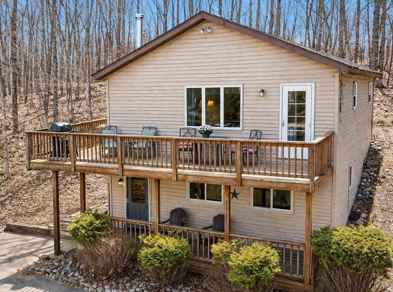Enjoy 130 feet of frontage on Lake Hilbert, a full recreation lake perfect for year-round fun. This 3-bedroom, 2 full bath home features an open-concept main level with beautiful lake views and a freestanding wood fireplace, creating a warm and inviting space. The lower level includes a spacious family room, additional bedroom, full bath, laundry area, and a walkout to the lake. Vaulted ceilings and a wraparound deck add to the charm and provide great outdoor living space. Offered fully furnished and move-in ready, including a pedal boat, kayaks, and row boat. Just bring your suitcase and start enjoying lake life.